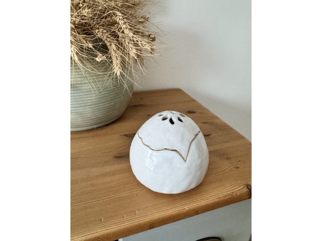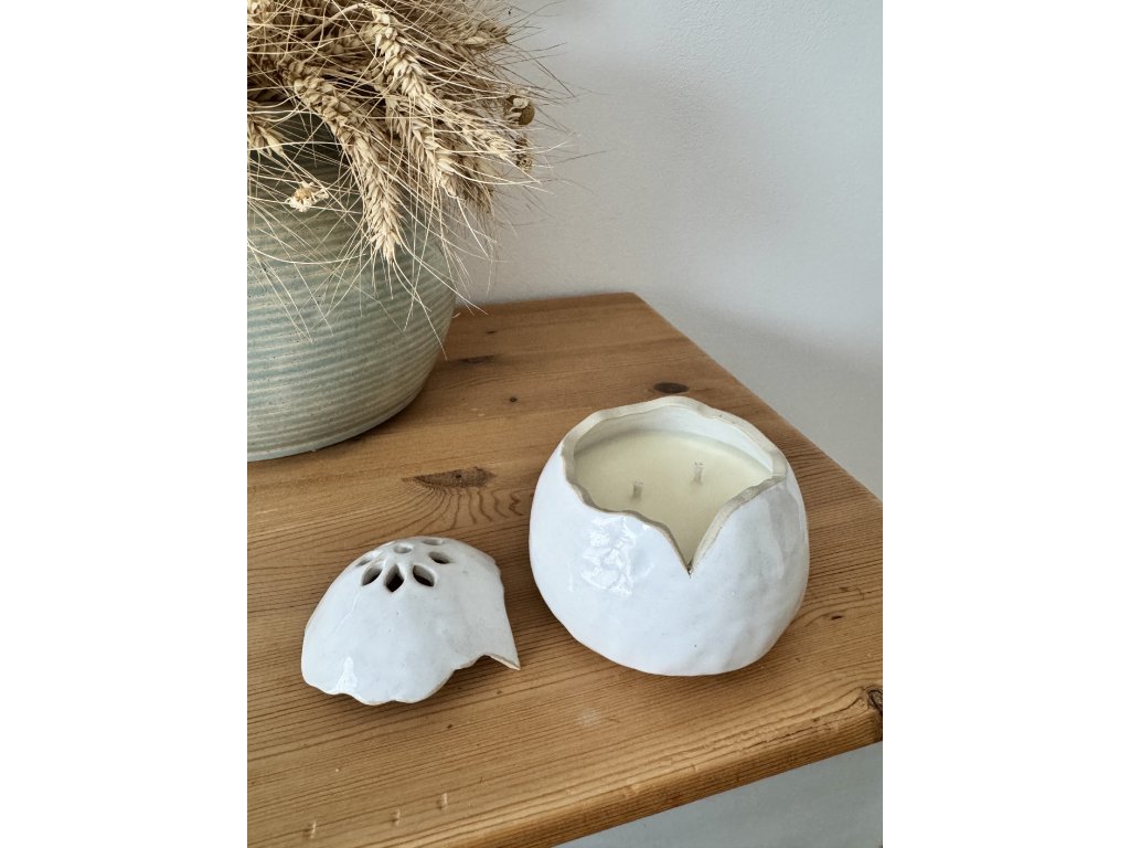 Krásné bílé vejce se skořápkou pro vás ve své dílně vyrobila Lenka Hložková a já ho s radostí naplnila sójovým voskem s oblíbenou svěží dřevitou vůní.